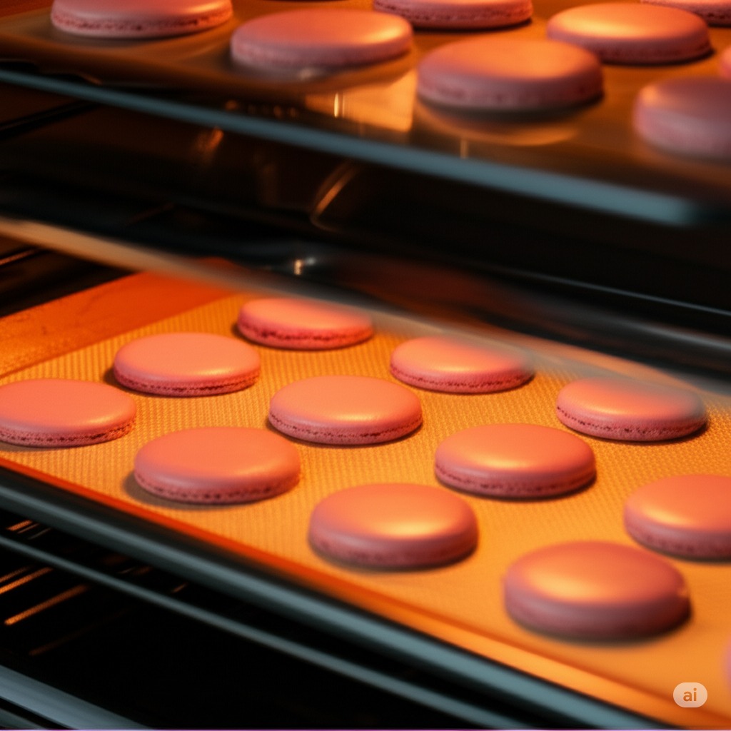 오븐을 150℃로 예열한 후, 말린 마카롱 꼬끄를 넣고 12~15분 정도 구워줍니다. 오븐 사양에 따라 굽는 시간과 온도가 다를 수 있으니 주의하세요. 굽는 동안 꼬끄 아래로 예쁜 삐에가 올라오는 것을 확인할 수 있습니다.