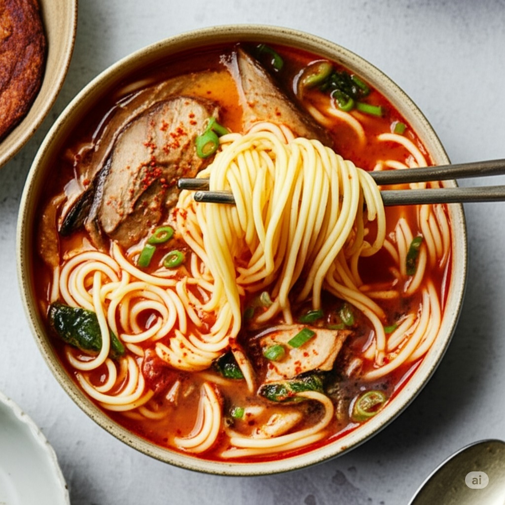 그릇에 삶은 면을 담고 뜨거운 짬뽕 국물을 부어줍니다. 기호에 따라 부추나 후추, 참기름 등을 첨가하여 마무리합니다.