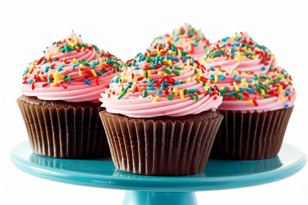 알록달록 예쁘게 완성된 컵케이크들이 접시나 케이크 스탠드에 놓여 있는 모습입니다. 맛있어 보이는 컵케이크를 보며 뿌듯함을 느낄 수 있습니다. 이제 맛있는 컵케이크를 즐기세요!
