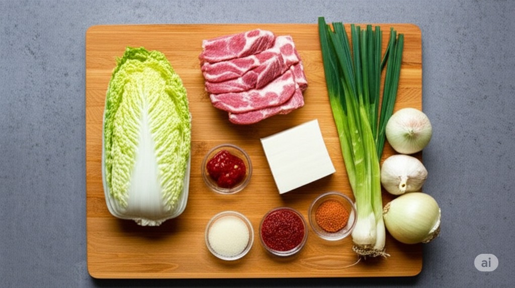 잘 익은 김치 1/4포기, 돼지고기(찌개용) 100g, 두부 1/4모, 양파 1/4개, 대파 1/4대, 청양고추 1개, 다진 마늘 1/2큰술, 국간장 1큰술, 고춧가루 1큰술, 설탕 약간, 식용유 약간, 쌀뜨물 4컵을 준비
