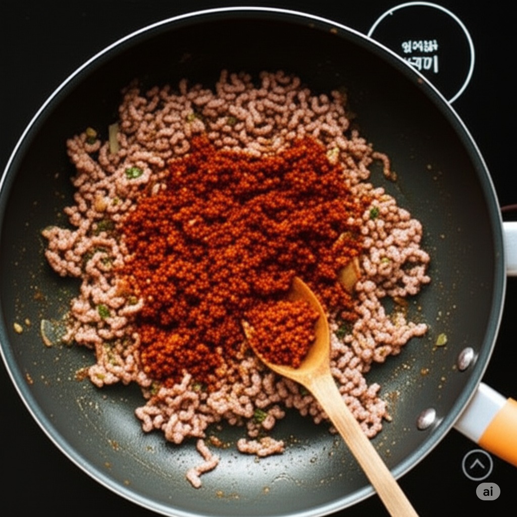 김치와 돼지고기가 잘 볶아지면 고춧가루, 다진 마늘, 국간장을 넣고 골고루 섞으며 볶는다. 양념이 김치와 돼지고기에 잘 배도록 합니다.