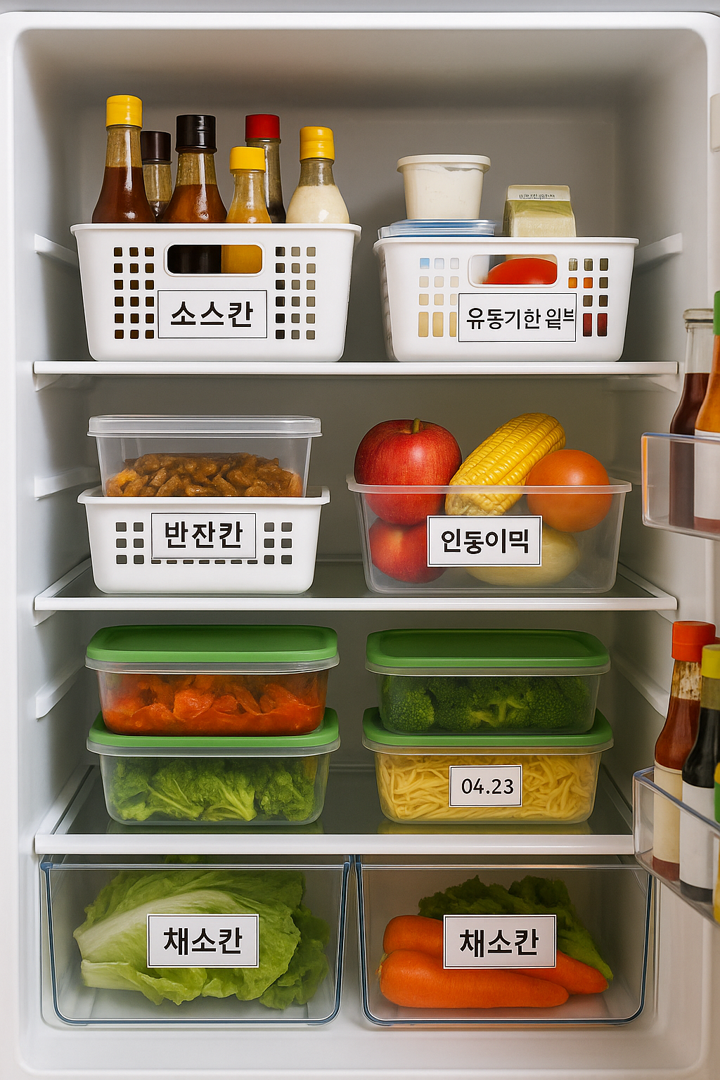 - 채소칸, 유제품칸, 반찬칸, 소스칸 등 용도별 구역 지정